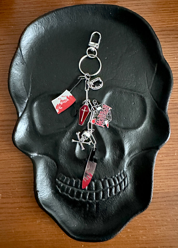 Horror fans will grin wickedly every time this gory bag charm tinkles. It features 7 metal and acrylic charms attached to a silver chain, including a bloody meat cleaver, fangs, black bat, red coffin, horror stabbed heart, skull and crossbones, and bloody knife. Both knives are shiny. Measuring approximately 7.25 inches in total length, it’s the perfect size to attach to your purse, bag, zipper, or keychain.