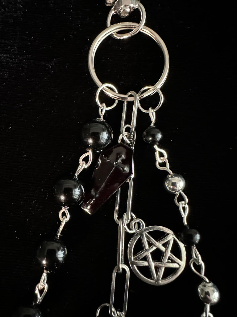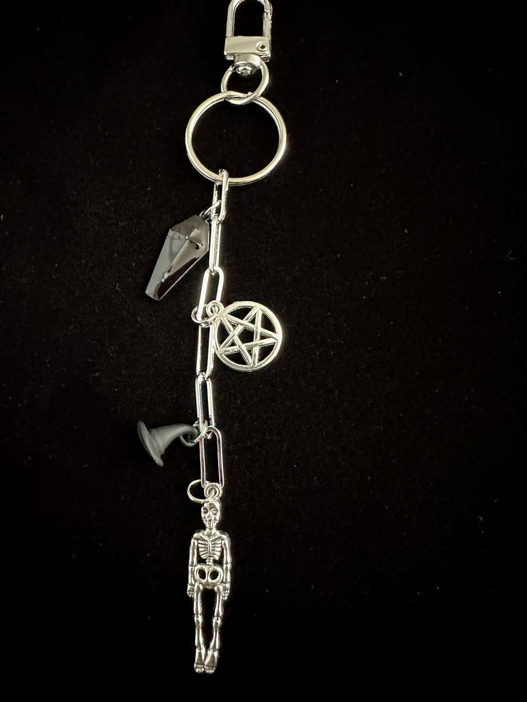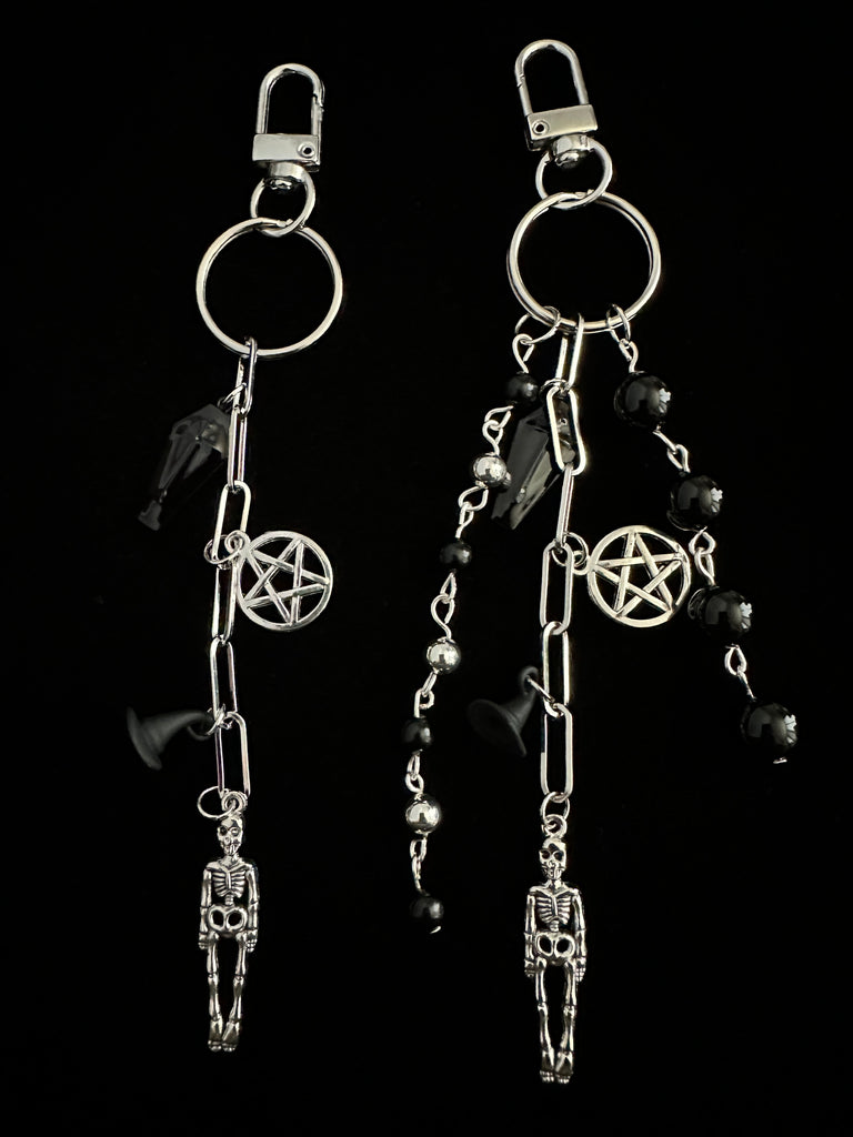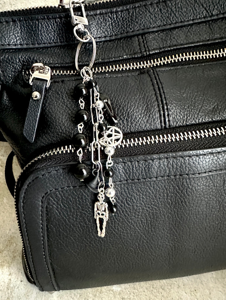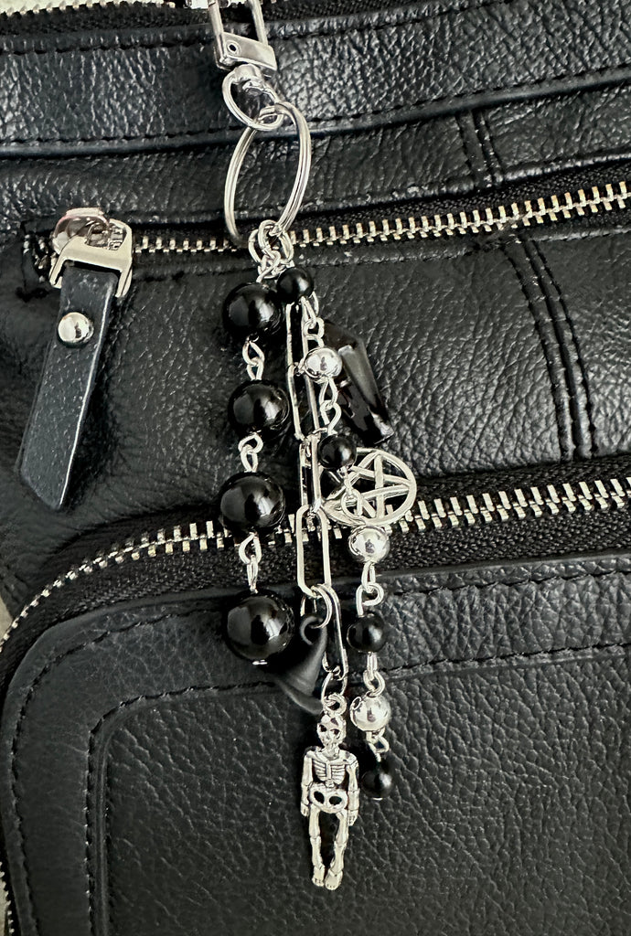 Show off your love for horror with this spooky silver and black bag charm. It features four silver and black charms, including a coffin, pentacle, witch hat and skeleton, all attached to a silver chain. Available in two versions: just the chain + charms, or with the addition of two strings of black and silver beads. Measuring approximately 6.75 inches in total length, it’s the perfect size to attach to your purse, bag, zipper, or keychain.