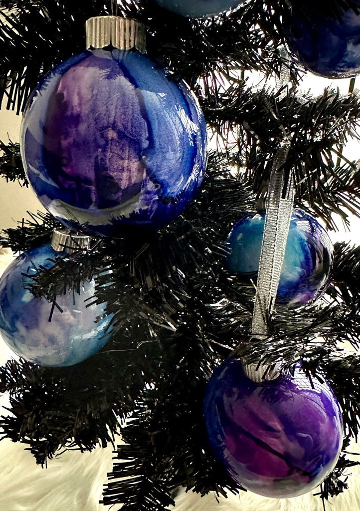 Celebrate the holiday season with these unique shatterproof hand painted alcohol ink Christmas ornaments. Made from durable unbreakable plastic, each round ornament features a beautiful, one-of-a-kind design painted on the inside with vibrant shades of purple, blue, pink, and white. Because of the nature of alcohol ink and internal painting process, no two ornaments are exactly alike, ensuring you receive a truly special piece.